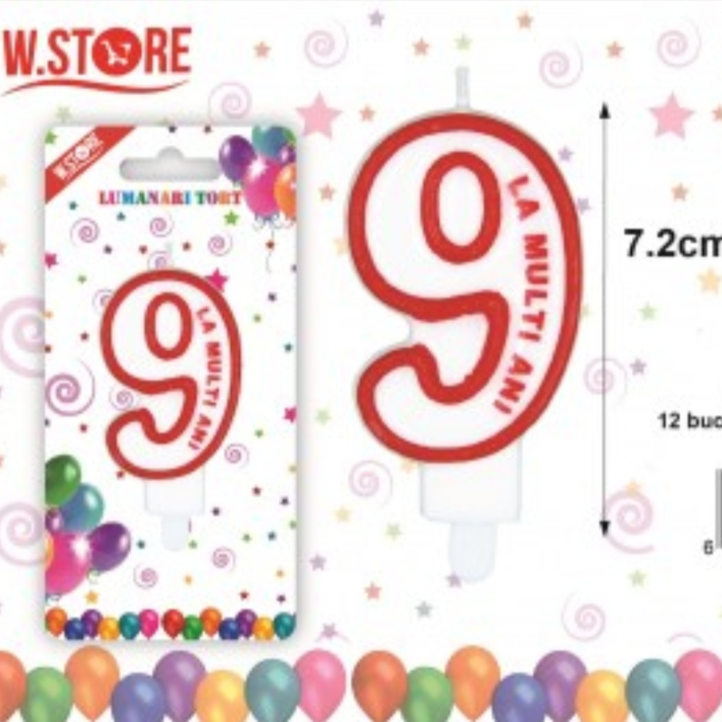 Lumanare aniversara din ceara, simbolizand cifra 9, inaltime de 72 mm, culori alb/rosu si scris pe o parte a ei mesajul La multi ani!