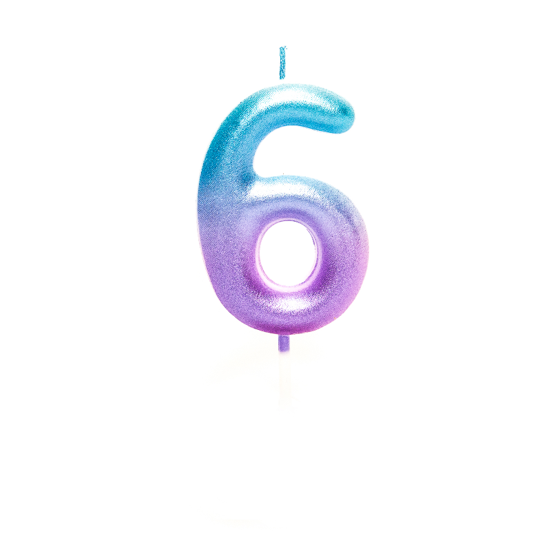 Lumanare aniversara din ceara, in forma de cifra 6, inaltime de 6 cm, culori sidefate albastru/mov sau roz/mov.